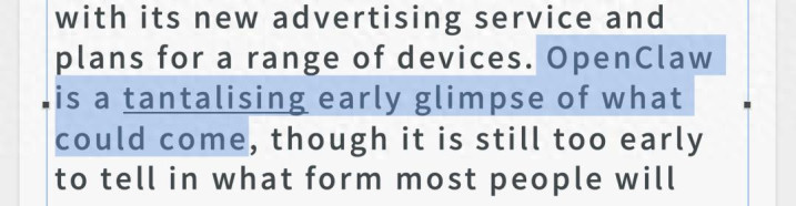 OpenClaw is a tantalising early glimpse of what could come.( OpenClaw 让东说念主们得以一窥将来可能的时势,何况这一远景极具蛊惑力。)
