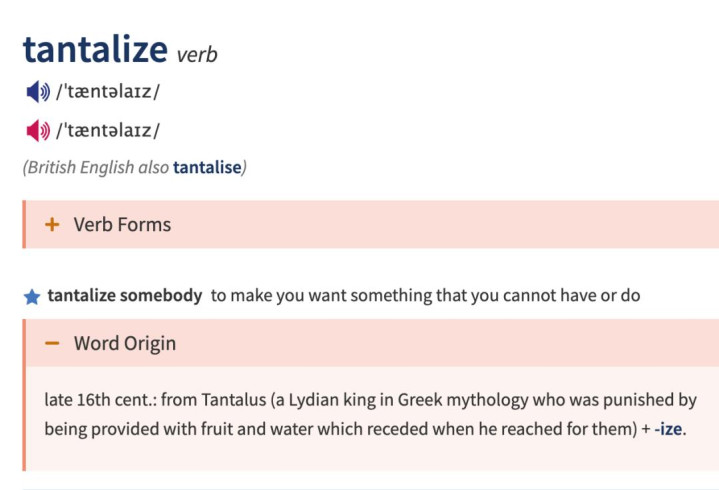 哈哈,开个打趣,其实真确狠恶的方位在于这个单词的词源:tantalize 来自于希腊据说中的东说念主物——坦塔罗斯(Tantalus)。