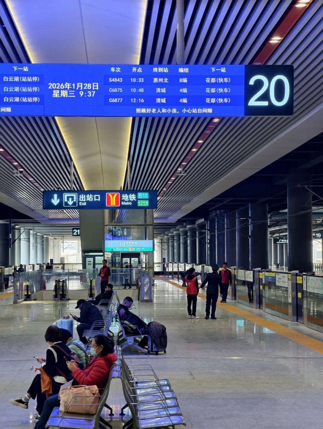 当天,广州地铁十二号线广州白云站E、J口绽开使用。E、J口均为单向进出口,是广州白云站地铁与城际铁路的陋劣换乘进出口。搭地铁的搭客从E口出闸后,可通往城际广州白云站,从城际广州白云站出闸的搭客不错从J口,平直参加地铁广州白云站。