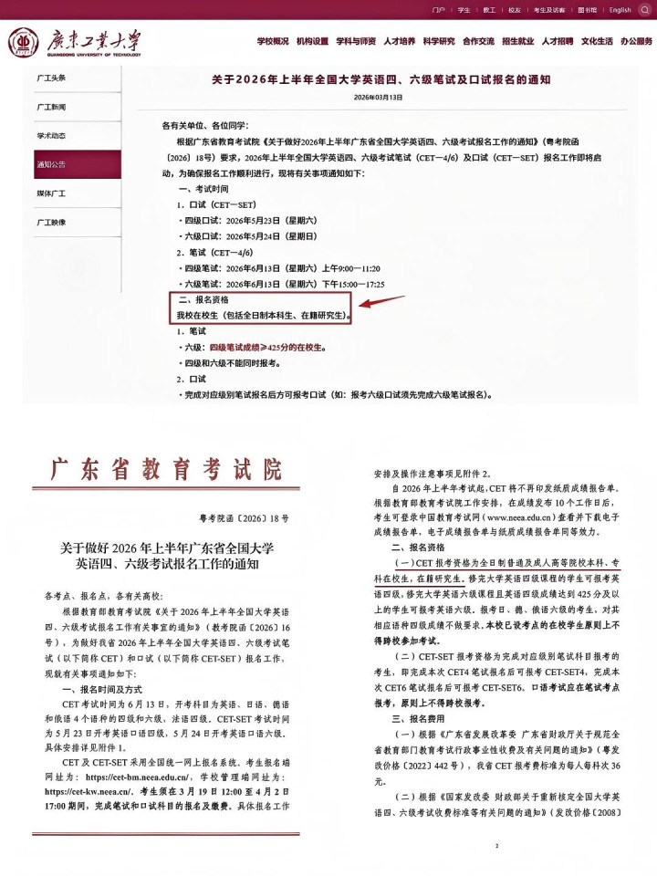 列位同学,把柄《对于作念好2026年上半年广东省宇宙大学英语四、六级西席报名职责的见告》(粤考院函〔2026〕18号)最新策略条目,自2026年起,非全日制专业、本科学生不再具备大学英语四、六级西席报考经历。因此,【广东工业大学、广东外语外贸大学】将不再组织成东说念主老师类学生报考大学英语四、六级西席。