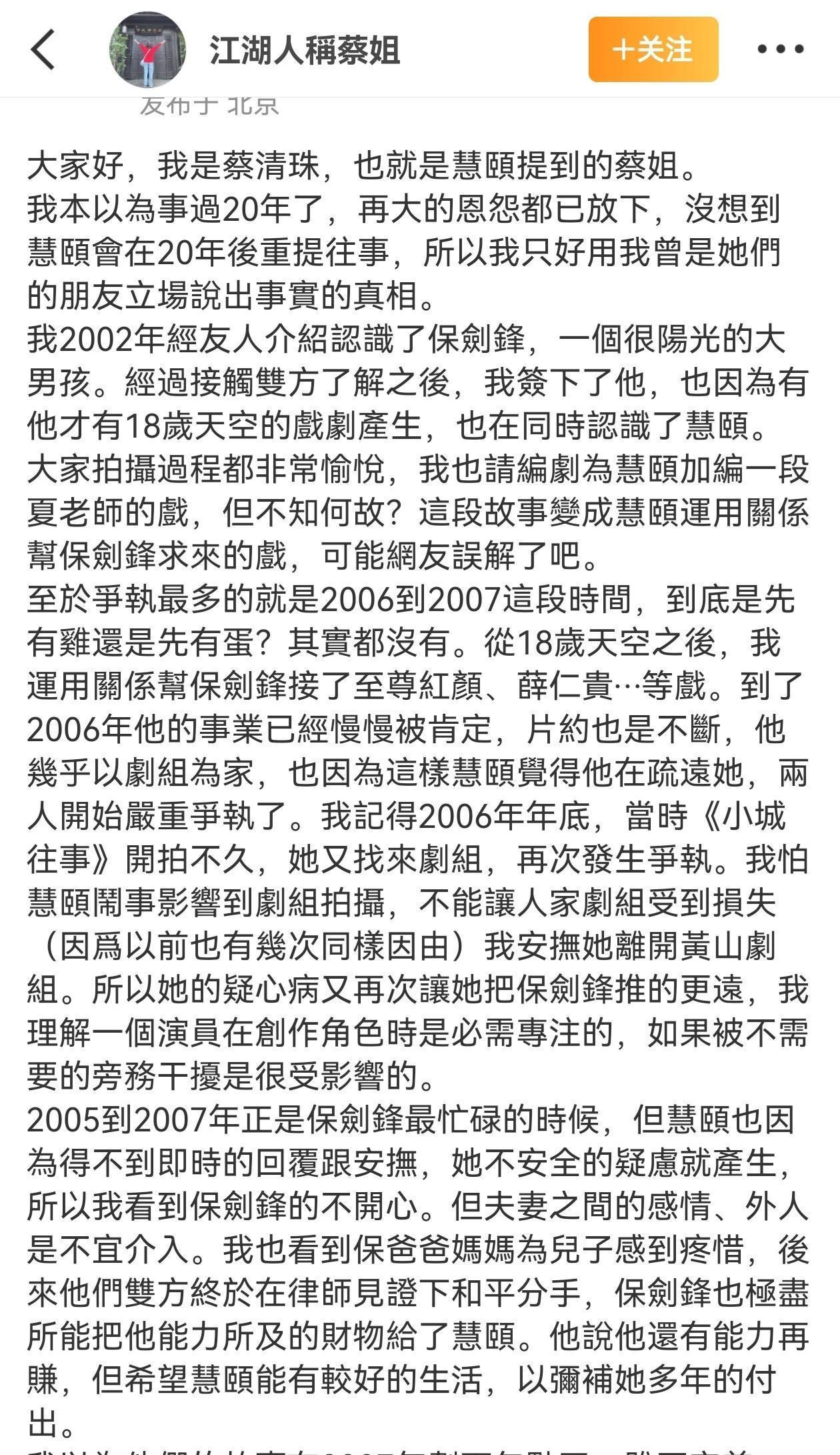 她坚称2005到2007年保剑锋和黄慧颐还处于婚配中,可保剑锋我方早就在节目里亲口说过,2006年拍《小城旧事》时就和现任浑家何珈好相恋了。一边是法律上还没离的婚,一边是公开承认的“三年恋爱”,这期间根柢对不上——不是出轨是什么? 更痛楚的是,这位“蔡姐”账号只柔顺保剑锋一东谈主,滚球(中国)官网app发文也仅此一篇,摆明等于临时开号来洗白的。保剑锋还在下面留言“好久不见”,立马被网友捉弄:“昨天鄙人悄悄见过?”操作之生硬,连吃瓜全球王人看不下去了。