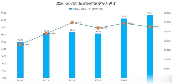 数据露馅,从2020-2025年,恒瑞各年包含成本化和用度化的研发插足离别达到49.89亿、62.03亿、63.46亿、61.5亿、82.28亿和87.24亿,六年研发总插足跨越406亿!