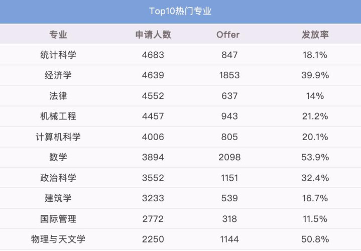 凭证UCL大学一共11所学院的央求数据统计,央求东谈主数最多的专科是统计科学,一共有4683东谈主,学校披发了847份Offer,该专科的Offer披发率为18.1%。和举座的披发率有着不小的差距。在排行前十的热点专科中,数学的Offer披发率是最高的,达到了53.9%,远超平均值。违反,披发率最低的则是海外贬责专科,仅有11.5%。