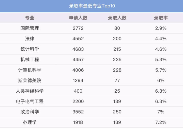 海外贬责专科在2772名央求者中终末仅收用80东谈主,收用比例仅为2.9%,是本年竞争最强烈的专科。紧随后来的法律和统计科学,诀别仅有4.4%和4.6%的收用率。在收用率最低的前十个专科中,理工科类占据了半壁山河,思要央求的学生需要提前商量好我方的A-Level选课以及有关隘试。