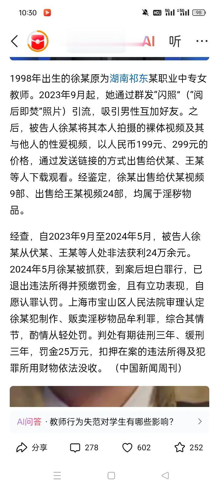 把柄法院的认定书,徐某是1998年出身的,在湖南祁东某功绩中专当西宾,从2023年9月到2024年5月,这短短8个月里,她干了一件见不得光的勾当——卖我方的裸照,还有我方和别东说念主的性爱视频,靠着这个,违警赚了24万多块钱。